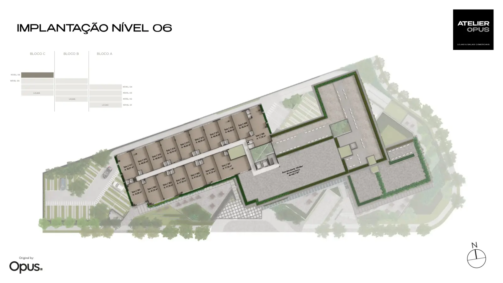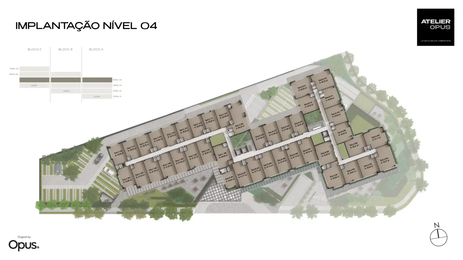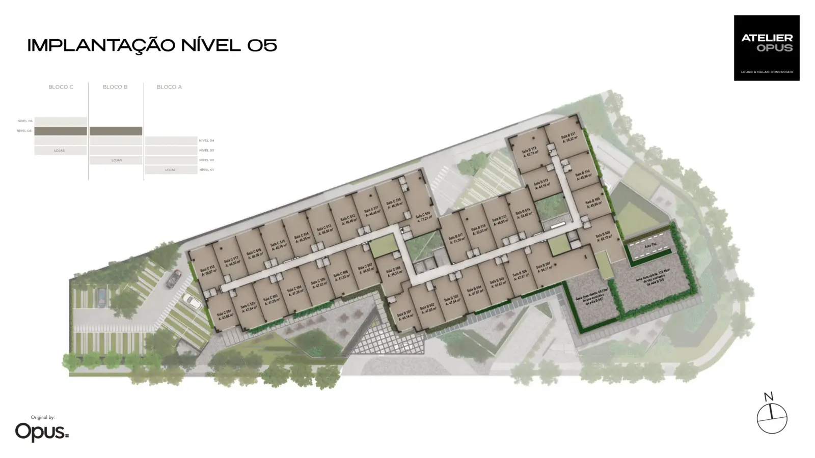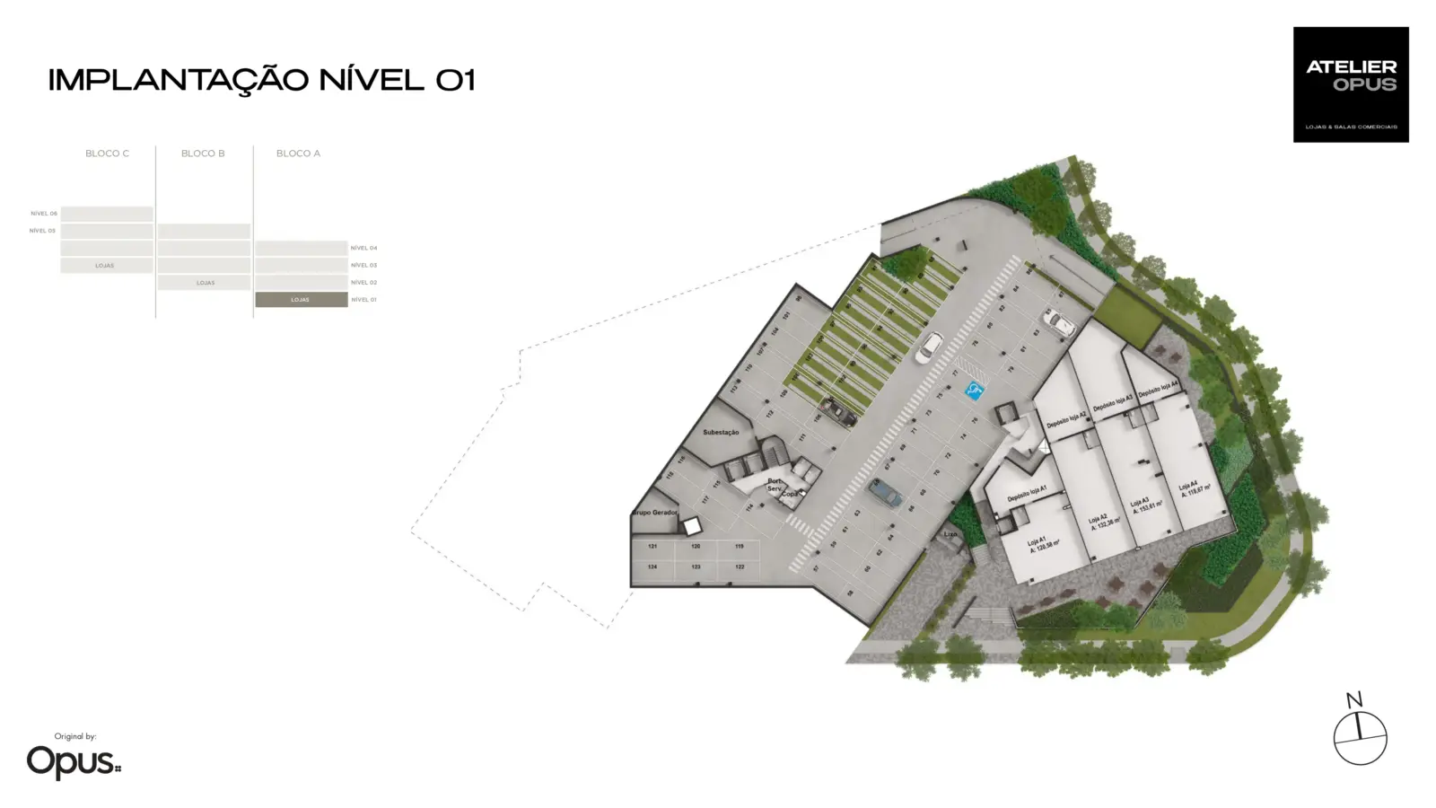 Distribuído em subsolos, térreo e três pavimentos tipo, o Atelier Opus reúne salas comerciais de aproximadamente 37 a 94 m² e lojas comerciais de 47 a 153 m², oferecendo diversidade de opções para negócios, consultórios, escritórios, lojas e serviços corporativos.